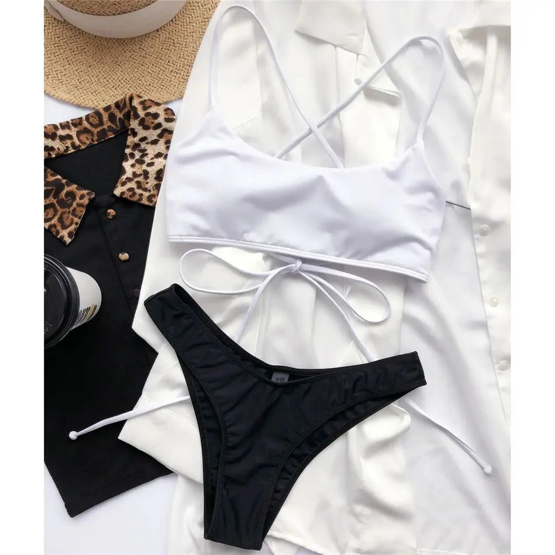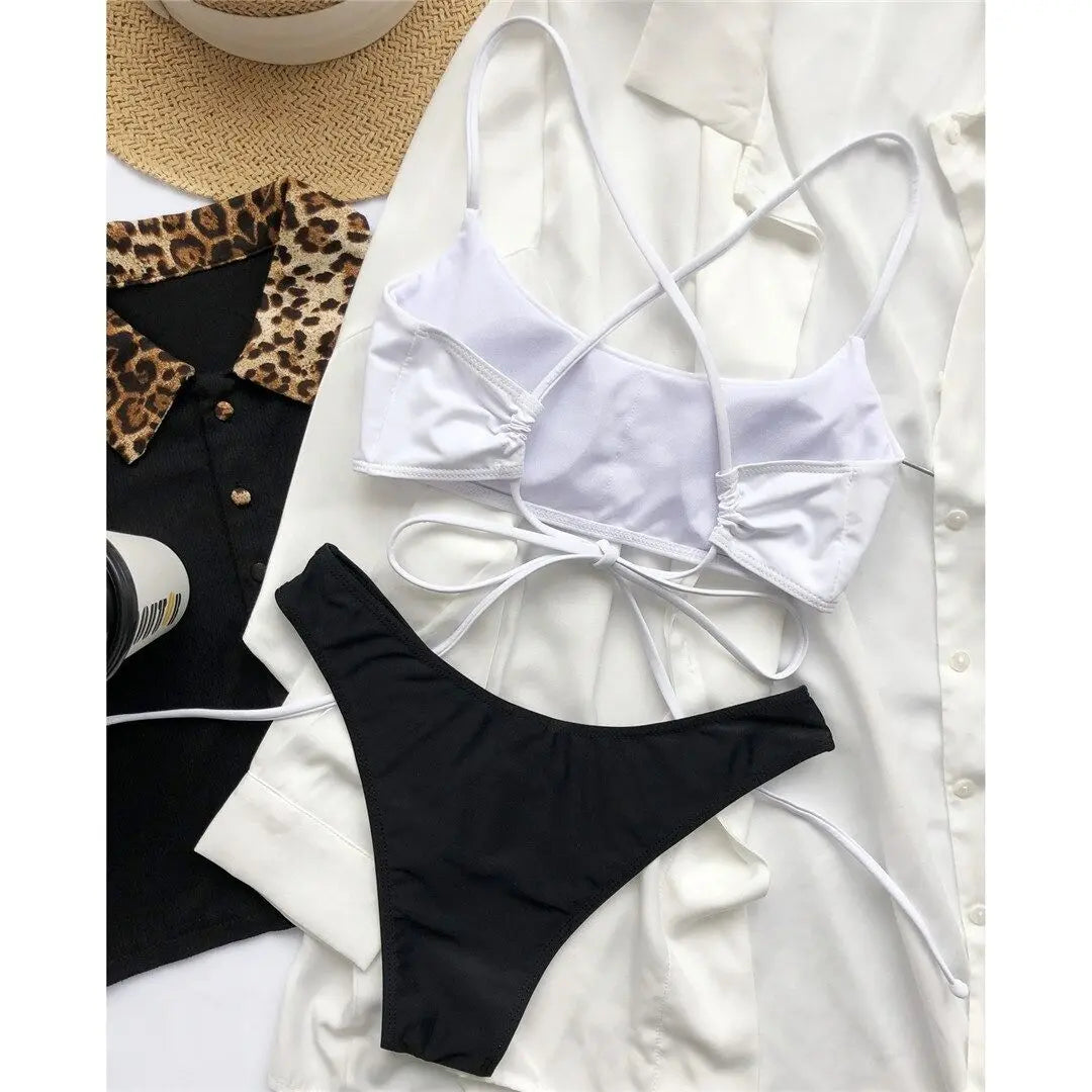 Costum de baie 2 piese, alb cu negru, Malu C57