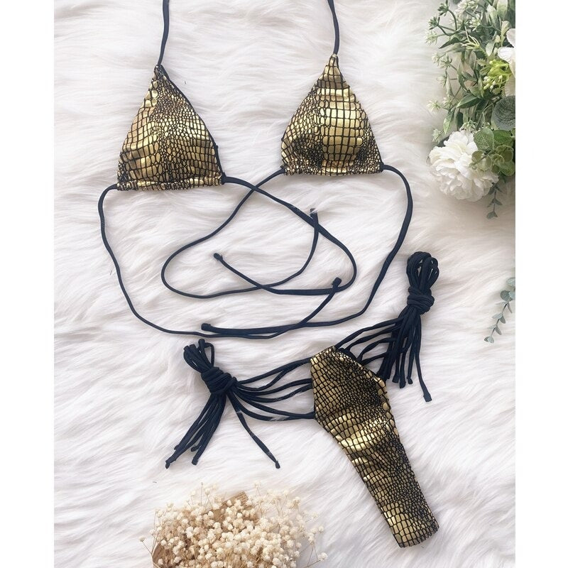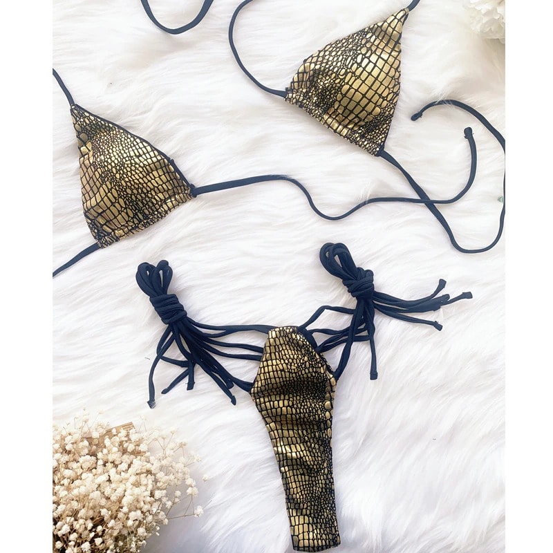 Costum de baie 2 piese, auriu, imprimeu piele crocodil, Linnie C37
