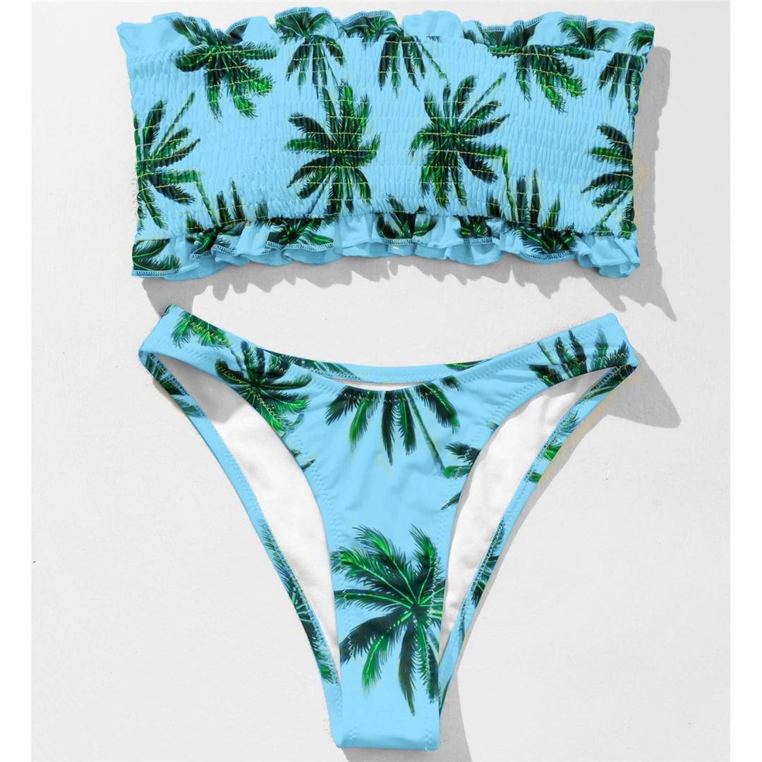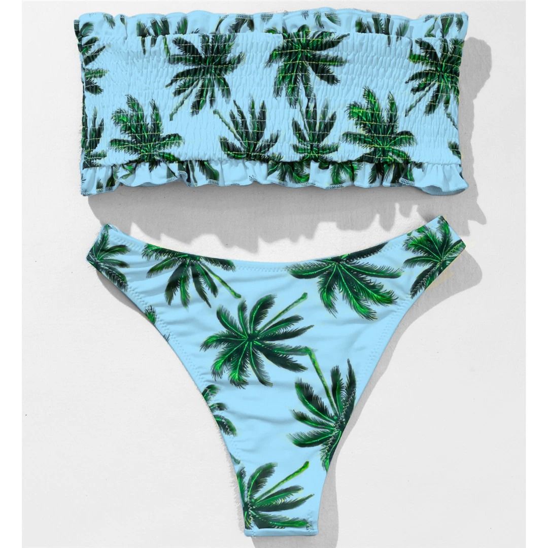 Costum de baie 2 piese, bleu, imprimeu palmieri, Nancie C38