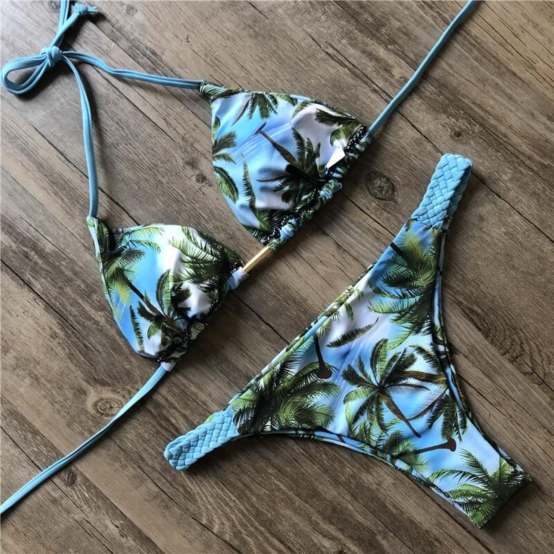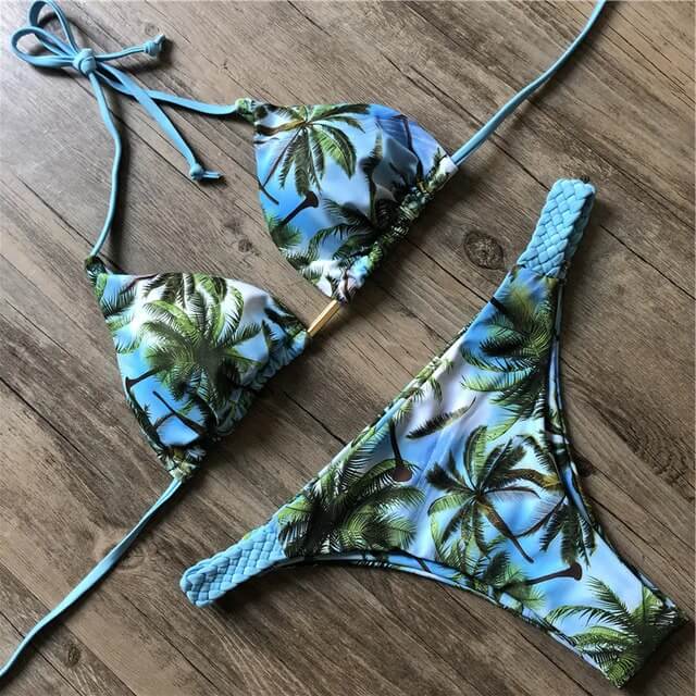 Costum de baie 2 piese, cu palmieri, bleu, Junnie C39