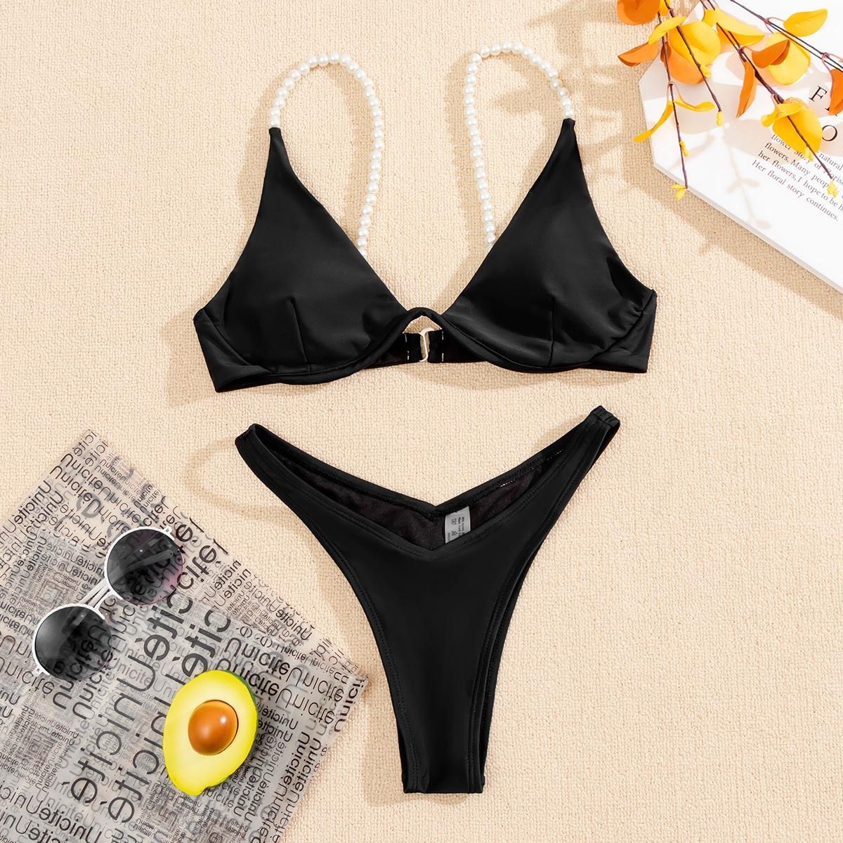 Costum de baie 2 piese, negru, bretele cu perle, Olina C45 OUT