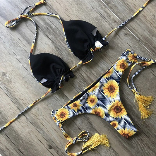 Costum de baie 2 piese, galben, imprimeu floarea soarelui, Magdelena C57